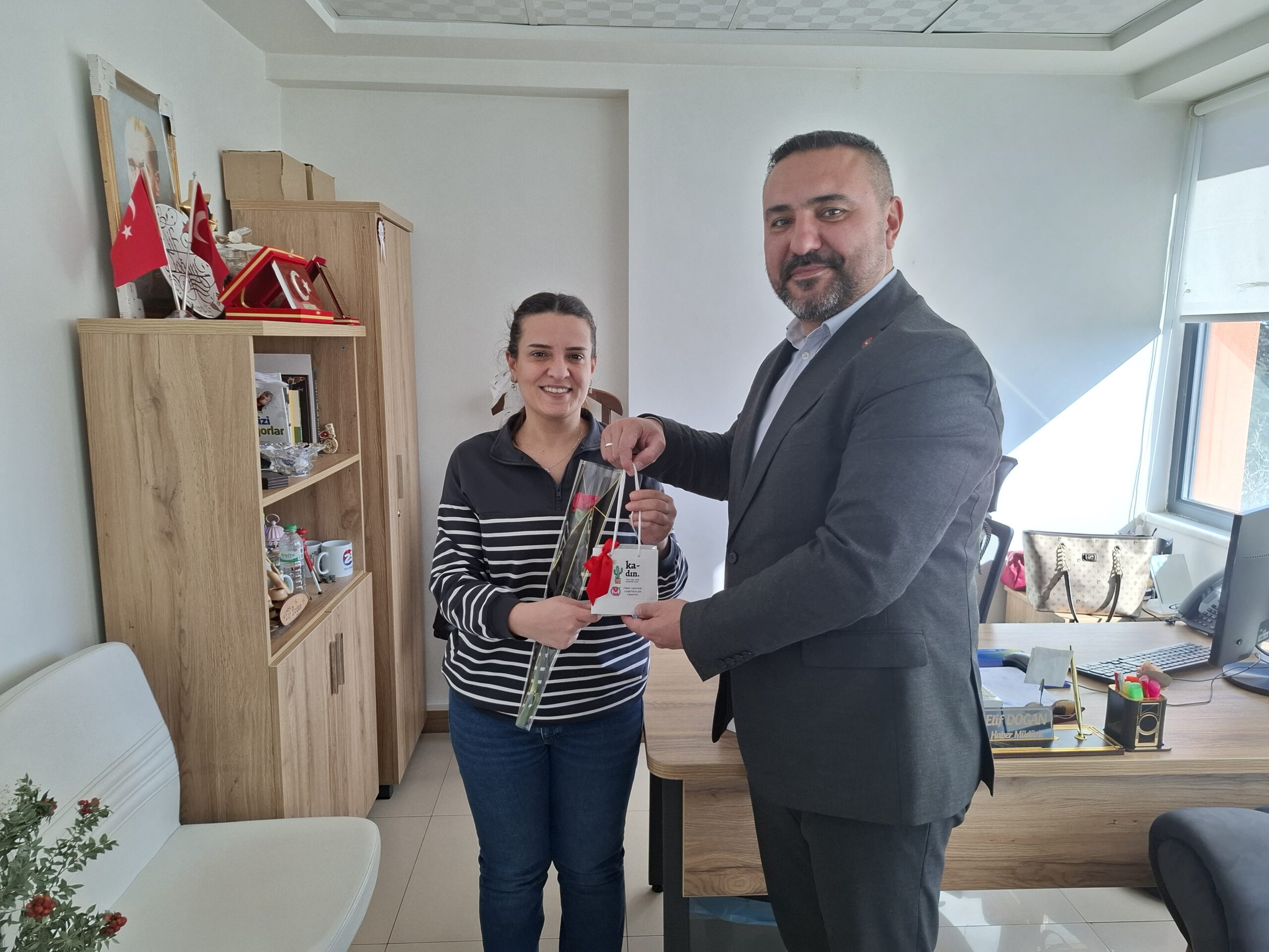 Fırat Havzası Gazeteciler Cemiyeti Başkanı Serkan Gürtürk, 8 Mart Dünya Kadınlar Günü dolayısıyla Elazığ’da bulunan basın ve medya kuruluşlarında görev yapan kadın çalışanları ziyaret etti. Ziyaret sırasında çalışan bayan basın mensuplarına karanfil takdim eden Gürtürk, günün anlam ve önemine binaen çeşitli hediyeler de takdim etti. Kadınların toplumdaki yerinin ve basın sektöründeki emeklerinin altını çizen FHGC Başkanı Serkan Gürtürk, ’’Kadınlar, hayatın her alanında fedakarlıkları, çalışkanlıkları ve azimleriyle toplumun temel direği olmuşlardır. Özellikle basın ve medya sektöründe, büyük bir özveriyle çalışan kadınlarımızın sesi, topluma ışık tutan bir rehber niteliğindedir. Onların kalemi, objektifi ve emeği, bizlere doğru ve tarafsız haberciliğin en güzel örneklerini sunmaktadır. Bu vesileyle tüm kadınlarımızın 8 Mart Dünya Kadınlar Gününü en içten dileklerimle kutluyor, sağlık, mutluluk ve başarılar diliyorum. Bu vesile ile geçtiğimiz aylarda uğradığı silahlı saldırı sonucu hayatını kaybeden kadın meslektaşımız Semra Demirelli’ye de tekrardan Allah’tan rahmet ailesine sabırlar dilerim. Kadın şiddet ve cinayetlerin son bulmasını temenni ederim” dedi.